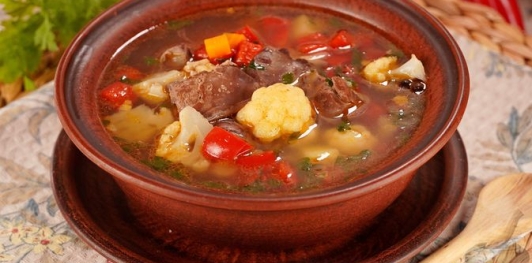Продукты Печень куриная — 250 г Капуста цветная — 250 г Перец болгарский красный — 200 г Картофель — 250 г Лук репчатый — 130 г Морковь — 150 г Чеснок — 5 г Зелень — 15 г Масло растительное — 30 мл Лист лавровый — 1-2 шт. Перец душистый горошком — 3-4 шт. Соль — 1 ч. ложка Перец чёрный молотый — 1/8 ч. ложки Вода — 1 л