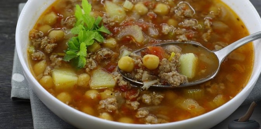 Сытный, ароматный и простой в приготовлении суп с фаршем и нутом. Сочетание нежного свиного фарша, питательного нута и овощей создаёт богатый вкус. Сельдерей придаёт блюду пикантность, а консервированные помидоры – лёгкую кислинку, которая прекрасно оттеняет пряность тимьяна. Использование фарша и консервированного нута значительно сокращает время приготовления.