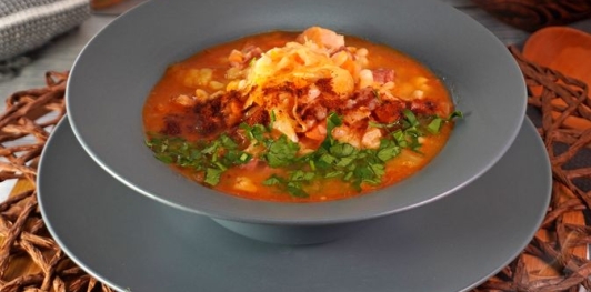 Сытный и ароматный суп с копчёной рулькой, квашеной капустой и фасолью. Фасоль варится вместе с копчёной рулькой, морковью и корнем петрушки, создавая насыщенную и выразительную основу блюда. Квашеная капуста придаёт приятную кислинку, а копчёная паприка подчёркивает вкус блюда лёгкими дымными нотками.