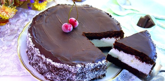 Продукты (на 9 порций) Бисквит: Яйца — 2 шт. Сахар — 150 г Молоко — 120 мл Масло растительное — 60 г Мука — 170 г Какао-порошок — 40 г Сода — 1 ч. ложка Уксус 9% — 1 ч. ложка Соль — 0,4 ч. ложки. Кипяток -100 мл * Крем: Желатин — 10 г Вода для замачивания желатина — 45 мл Вода для сахарного сиропа — 65 мл Сахар — 110 г Лимонная кислота — 0,4 ч. ложки Белки — 70 г (понадобятся белки 2 яиц) Соль — 1 щепотка Сахар ванильный — 1 ч. ложка * Глазурь: Шоколад тёмный — 200 г Масло сливочное — 40 г Масло растительное — 30 мл