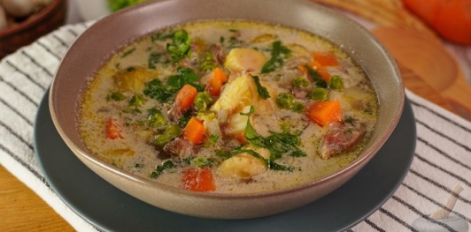 Насыщенный суп на бульоне из утки с брюссельской капустой, зелёным горошком, морковью и корнем петрушки. Нежные сырные клёцки и сметанная заправка придают супу большую питательность и аппетитные сливочные нотки.