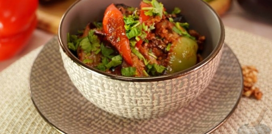 Продукты (на 3 порции) Баклажаны — 500 г Перец сладкий — 400 г Орехи грецкие — 70 г Кинза — 25 г Масло растительное — 75 мл * Для заправки: Соус соевый — 15 мл Масло растительное — 30 мл Уксус бальзамический 6% — 30 мл Сахар — 8 г (1 ч. ложка) Горчица зернистая — 30 г (1 ст. ложка с горкой) Чеснок — 8 г (2 зубчика) Перец острый свежий — 30 г Паприка молотая — 6 г (1 ч. ложка с горкой) Кориандр молотый — 7 г (1 ч. ложка) Соль — по вкусу