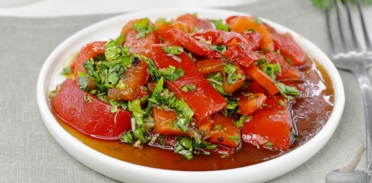 Продукты (на 4 порции) Перец болгарский – 1 кг Кинза – 15 г Петрушка – 15 г Чеснок – 10 г Соевый соус – 45 мл Мёд – 30 г Уксус 9% – 5 мл Масло растительное – 40 мл Перец чёрный молотый – 0,5 ч. ложки Базилик сушёный – 0,5 ч. ложки Розмарин сушёный – 0,5 ч. ложки Паприка копчёная молотая – 0,5 ч. ложки Перец красный острый молотый – по вкусу