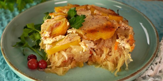 Продукты Квашеная капуста – 600 г Картофель – 800 г Лук репчатый – 270 г Сметана – 200-250 г Масло сливочное – 50 г Масло растительное – 30 мл Тмин – 1 ч. ложка Орех мускатный молотый – 1 щепотка Соль – по вкусу Перец чёрный молотый – по вкусу